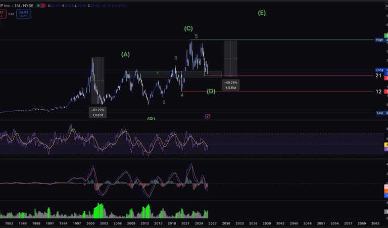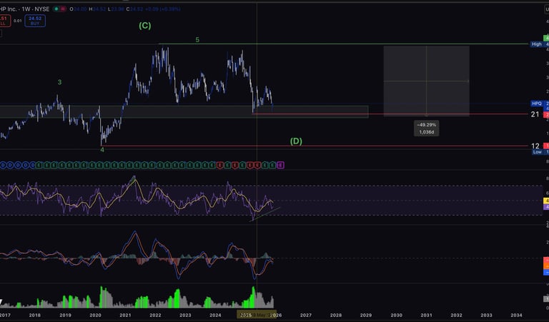 Long-term higher timeframe shows HPQ has historically produced strong rebounds from similar macro pullback zones.