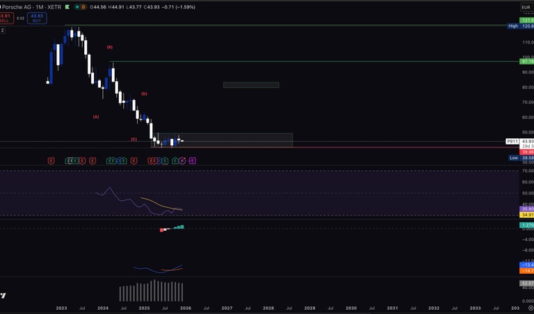 Porsche has completed a major corrective phase of –68% from the cycle high.